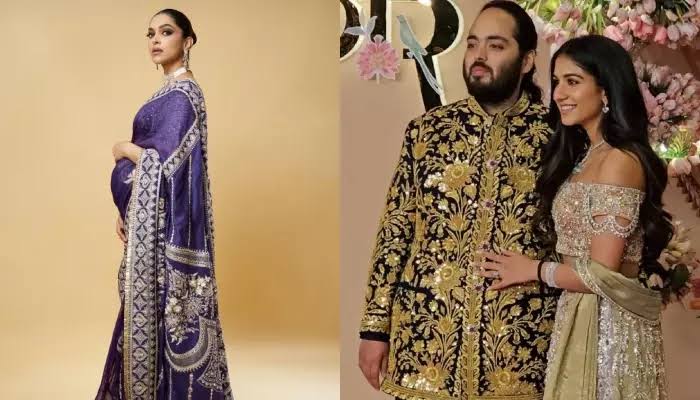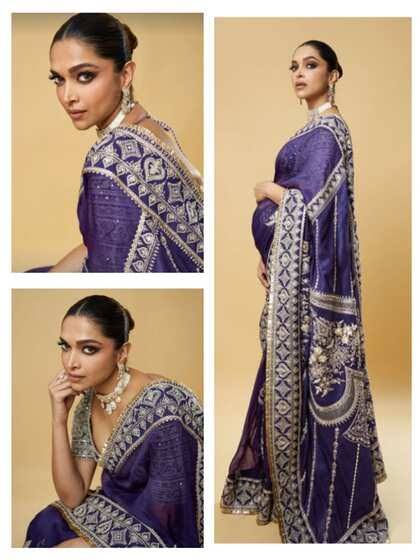 தீபிகா படுகோன் ஊதா மற்றும் வெள்ளிப் புடவையில் ராஜரீகமாகத் தோன்றினார். நேர்த்தியான ரொட்டி மற்றும் சோக்கர் நெக்லஸுடன் அவள் தோற்றத்தை உயர்த்தினாள். புகைப்படங்களில், கேமராவைப் பார்த்து வித்தியாசமான போஸ் கொடுத்தார்.