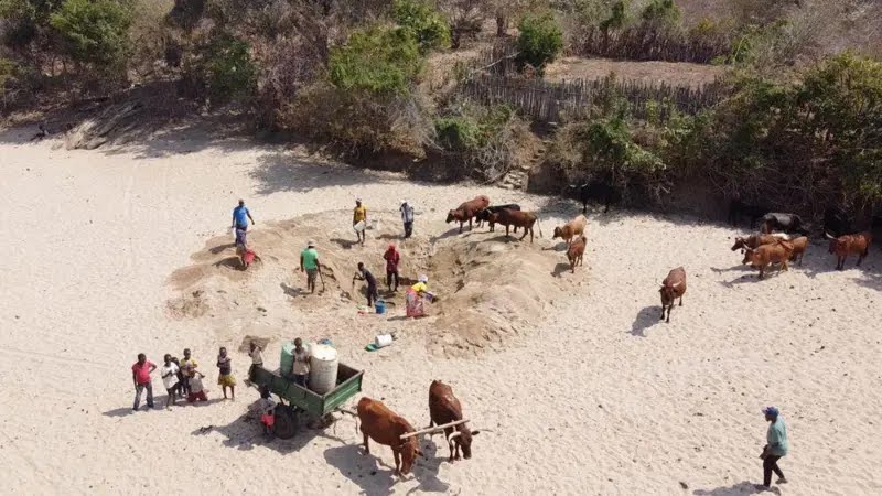 வொம்போசி பொதுவாக ஆண்டு முழுவதும் பாய்கிறது, ஆனால் இப்போது கண்ணுக்கு எட்டிய தூரம் வரை வெறும் பழுப்பு நிற மணல்தான்.மண்வெட்டிகள் மற்றும் வாளிகளுடன் ஆயுதம் ஏந்திய மனிதர்கள் ஆற்றின் தரையைத் தோண்டி, அதிலிருந்து கடைசித் துளி நீரை எடுக்க தீவிரமாக முயற்சிக்கின்றனர்.மாவட்டத்தின் பிற பகுதிகளில் உள்ள ஆறுகள் மற்றும் அணைகள் வறண்டுவிட்டதால், குறிமா கிராமத்தில் உள்ள குறிப்பிட்ட ஆற்றுப்படுகையில் அதிகமான மக்கள் இறங்கி, நீர் ஆதாரத்தில் அழுத்தம் கொடுக்கின்றனர்.ஆற்றங்கரையில் பல துளைகள் உள்ளன, அவை ஒரு வாளியைப் பொருத்தும் அளவுக்கு பெரியவை.