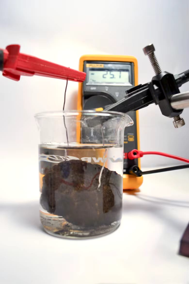 பிளாட்டினம் மின்முனைகள் முடிச்சுகளின் மின்னழுத்தத்தை அளவிடுகின்றன. (காமில் பிரிட்ஜ்வாட்டர்/வடமேற்கு பல்கலைக்கழகம்).முடிச்சுகளை மேலும் படிப்பது, ஆற்றல் மாற்றத்திற்கான சிறந்த தொழில்நுட்பத்தை உருவாக்க எங்களுக்கு உதவும் என்று கெய்கர் பரிந்துரைத்தார்.